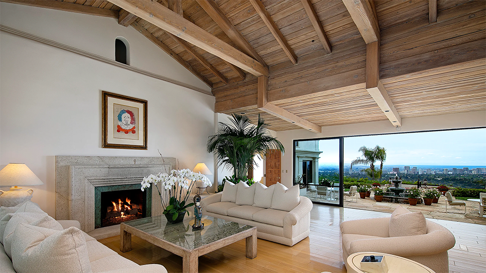 The fireplace catches the attention as one settles in this lovely living room, a few meters away from the patio. This lovely fireplace is 1 among the 6 other fireplaces situated in other spaces in this home. The sliding glass doors frame the amazing views across the patio that overlooks the rest of Beverly Hills. And finally, by introducing lush indoor palm against the white stucco walls, the warmth created by the natural wood ceiling and floor tones is further enhanced.